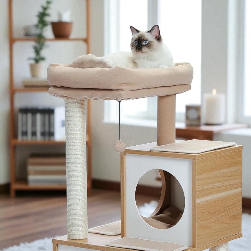 Adopte l’Arbre à chat Bois avec Perchoir et offre à ton chat une combinaison parfaite de design, confort et fonctionnalité dans un seul meuble élégant.