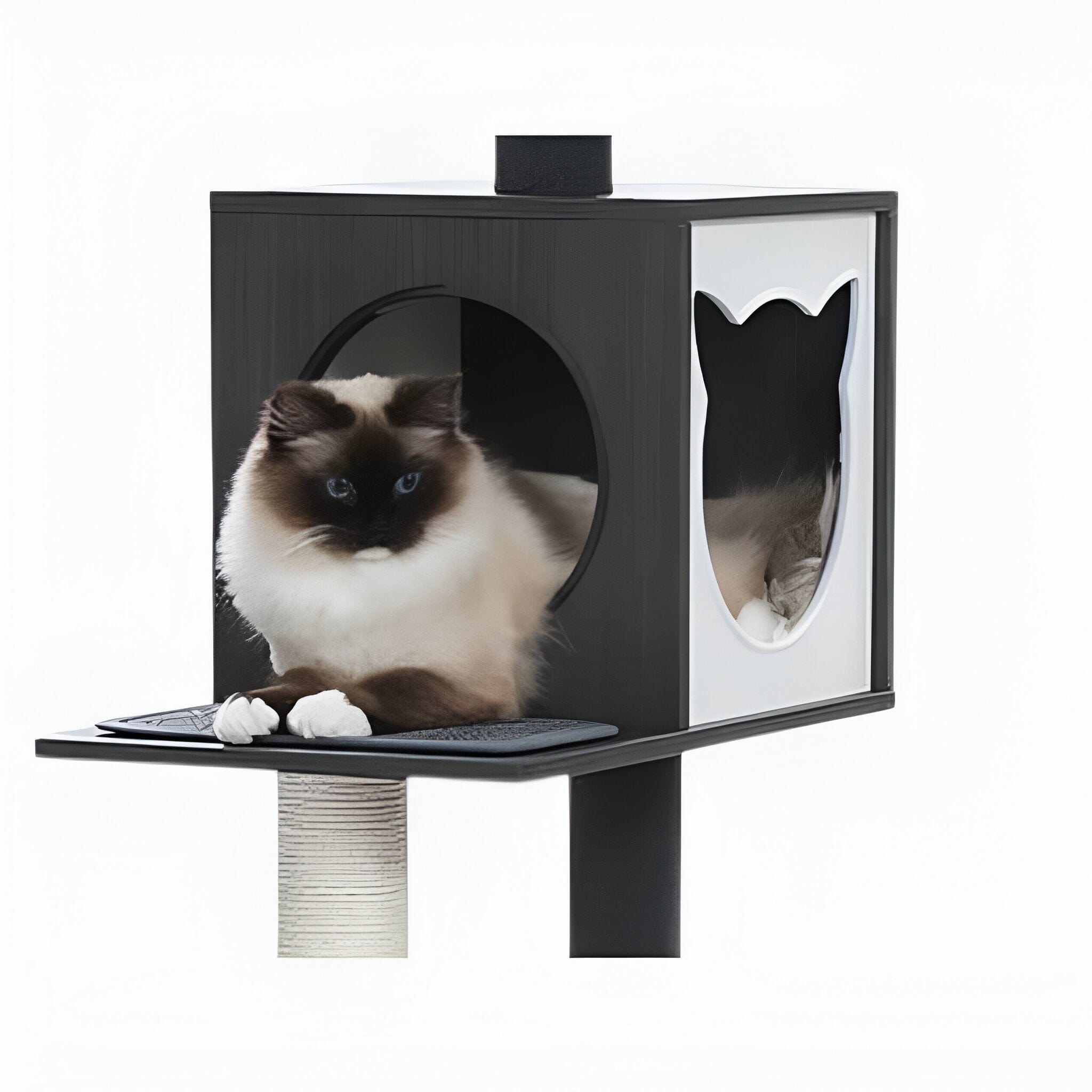 À la base de la structure se trouve une spacieuse cabane, parfaite pour les chats qui aiment le calme et l’intimité. Ce condo grand format est conçu en bois robuste et doublé d’un revêtement doux, transformant chaque sieste en pur moment de sérénité.