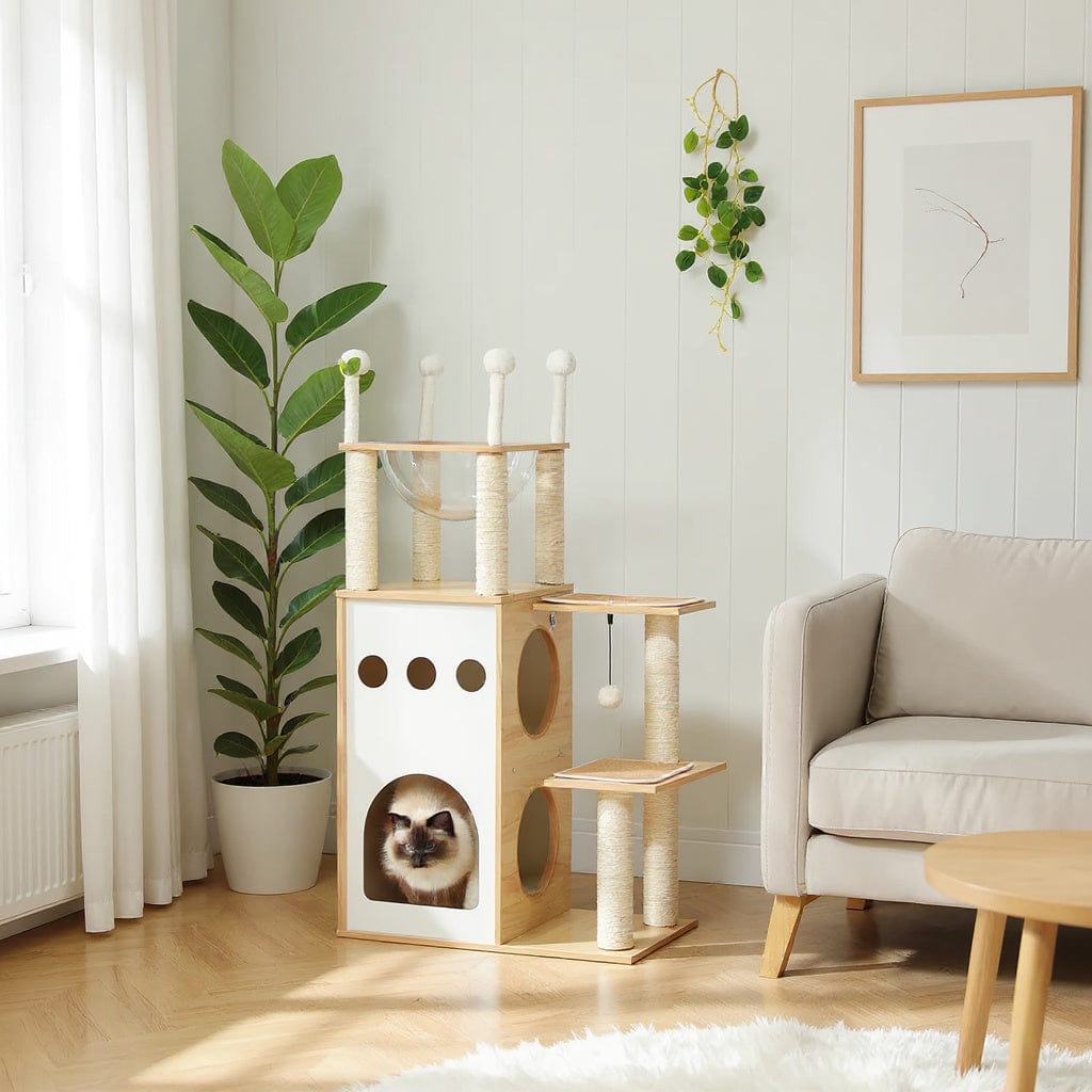Un espace unique mêlant bois et modernité, où ton chat peut jouer, observer et se détendre avec style.
