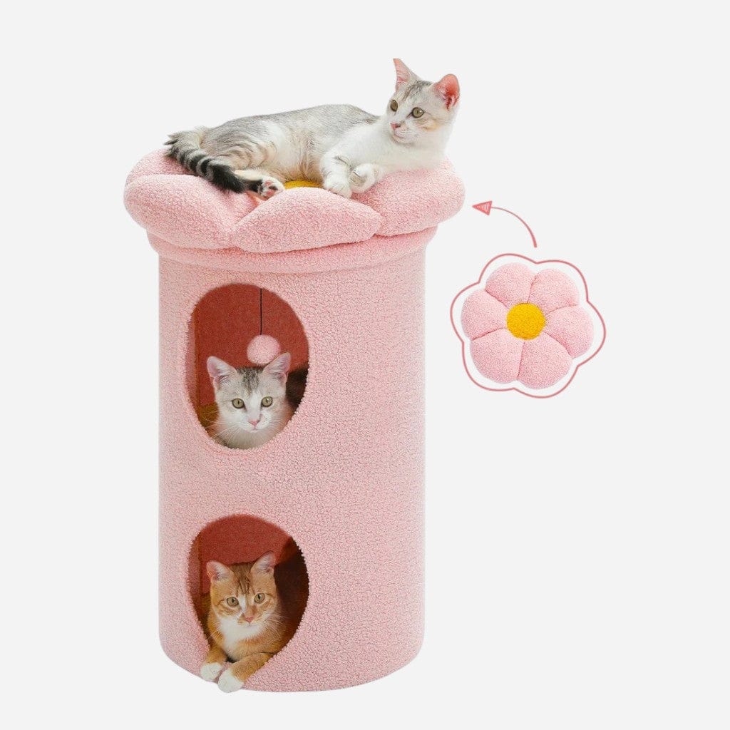 Pensé comme une plante géante, l’Arbre à chat Fleur Tour se compose d’une base stable, de deux niveaux intermédiaires, et d’un nid moelleux en forme de fleur au sommet. Idéal pour les intérieurs kawaii, pastel ou naturels, il attire l’œil et séduit tous les amoureux du beau… et du félin.