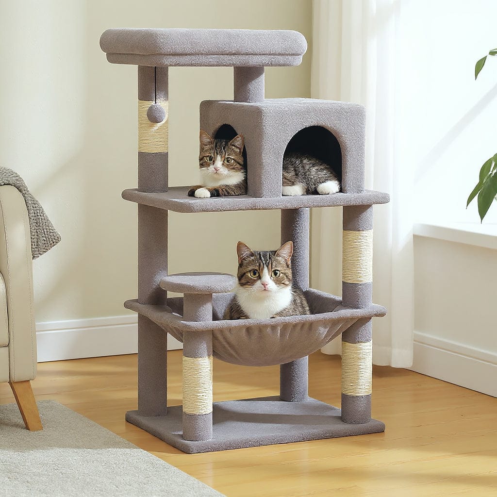 Adopte l’Arbre à chat Maine Coon Confort : le modèle parfait pour les grands chats qui aiment le confort, la hauteur… et les longues siestes dans un hamac tout doux.